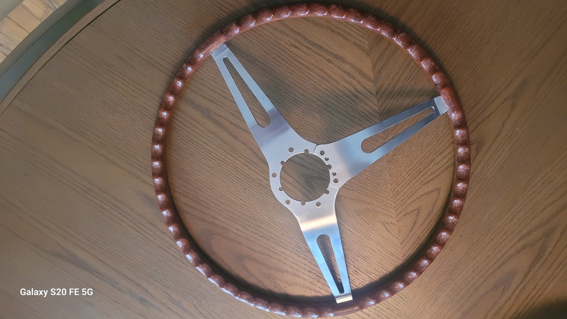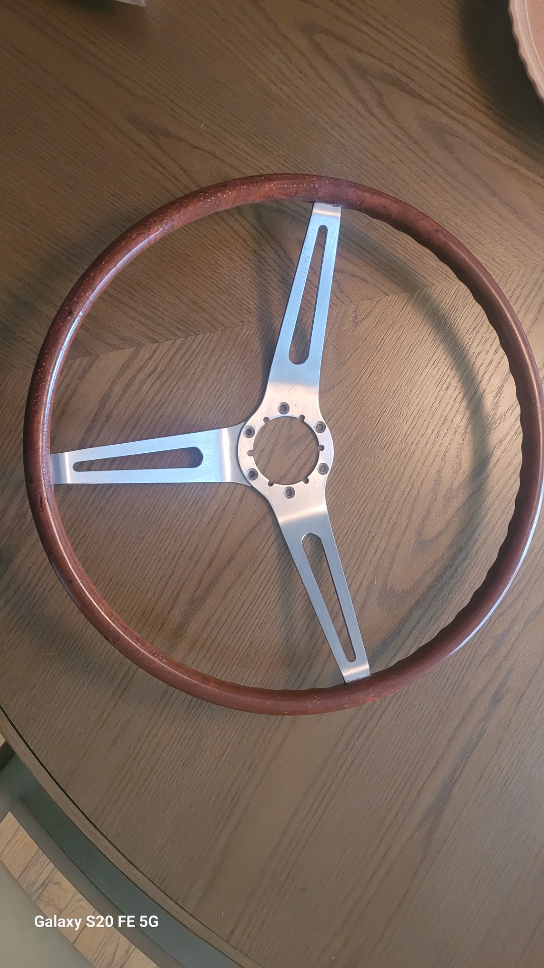 A mint 69 camaro  chevelle rosewood wheel. Zero cracks great color and swirls as all these wheels are unique…..super nice aluminum spokes.